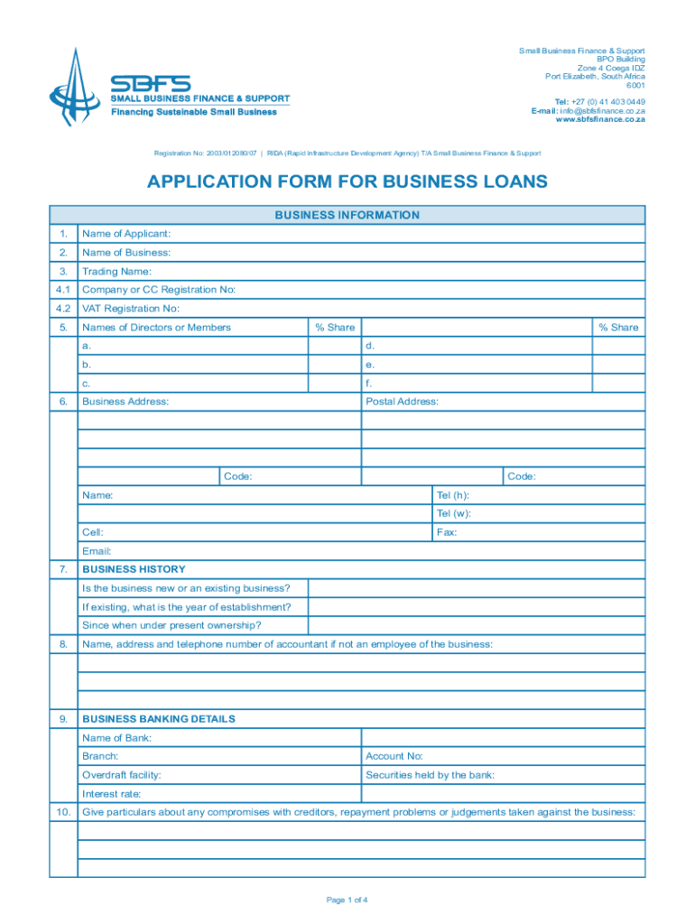 Small Business Finance & Support BPO Building Zone 4 Conga ID Port Elizabeth, South Africa 6001 Tel: +27 (0) 41 403 0449 Email: info@sbfsnance.co.za www.sbfsnance.co.zaRegistration No: 2003/012080/07