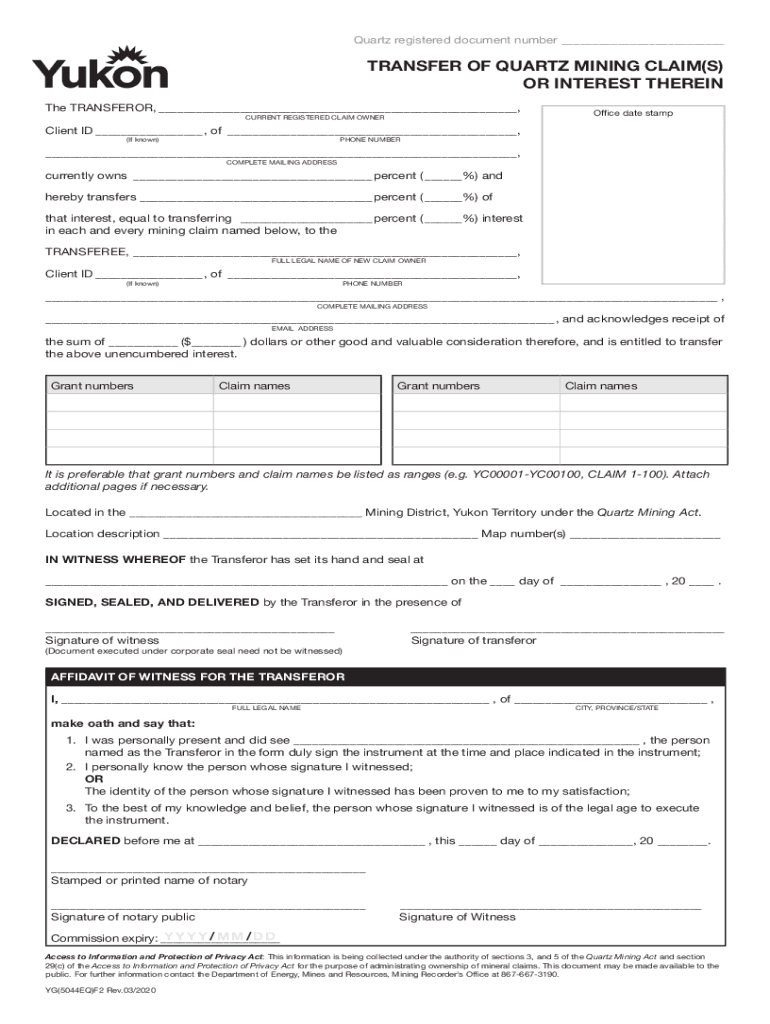 Quartz registered document number ___TRANSFER OF QUARTZ MINING CLAIM(S) OR INTEREST THEREIN The TRANSFEROR, ___, CURRENT REGISTERED CLAIM OpenOffice date stampClient ID___, of ___, (If known)PHONE