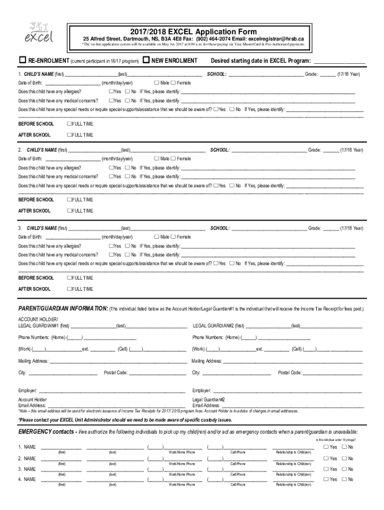 2017/2018 EXCEL Application Form 25 Alfred Street, Dartmouth, NS, B3A 4E8 Fax: (902) 4642074 Email: excelregistrar@hrsb.ca *The online application system will be available on May 1st, 2017 at 8:00
