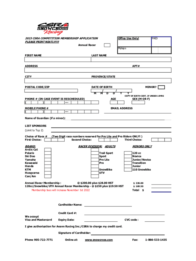 2023 CSA COMPETITION MEMBERSHIP APPLICATION PLEASE PRINT NEATLY!!!! Office Use Only! Annual RacerFIRST NAMEPAIDMylapsLAST NAMEADDRESSAPT#CITYPROVINCE/STATEPOSTAL CODE/UPDATE OF BIRTH / / M DD MINOR?