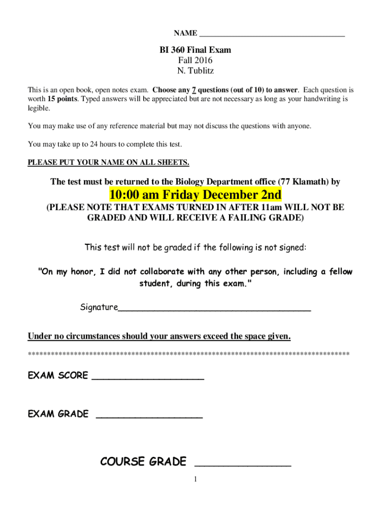 NAME ___BI 360 Final Exam Fall 2016 N. Tu blitz This is an open book, open notes exam. Choose any 7 questions (out of 10) to answer. Each question is worth 15 points. Typed answers will be appreciated