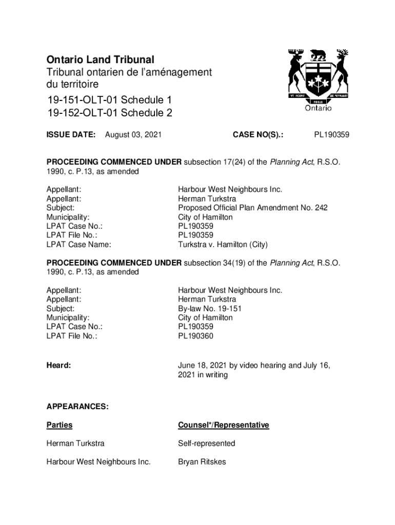 Ontario Land Tribunal Ontarian de management Du territory 19151OLT01 Schedule 1 19152OLT01 Schedule 2 ISSUE DATE:August 03, 2021CASE NO(S).:PL190359PROCEEDING COMMENCED UNDER subsection 17(24) of