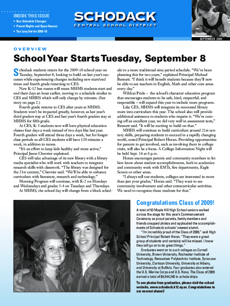 Bus Schedule ChangesSCHODACK Parent Nights and Open HousesCENTRAL SCHOOL DISTRICTINSIDE THIS ISSUE Tax Levy Set for 200910 SEPTEMBER 2009OVERVIEWSchool Year Starts Tuesday, September 8 chock students