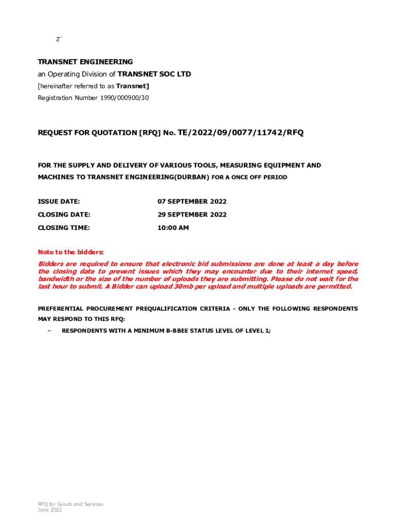 Z`TRANSFER ENGINEERING an Operating Division of TRANSFER SOC LTD [hereinafter referred to as Transnet] Registration Number 1990/000900/30REQUEST FOR QUOTATION [RFQ] No. TE/2022/09/0077/11742/FOR THE
