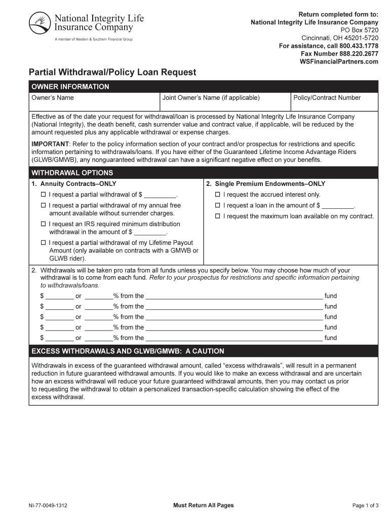 The form is specifically for policyholders of National Integrity Life Insurance Company who wish to request a partial withdrawal or loan on their life insurance policy.