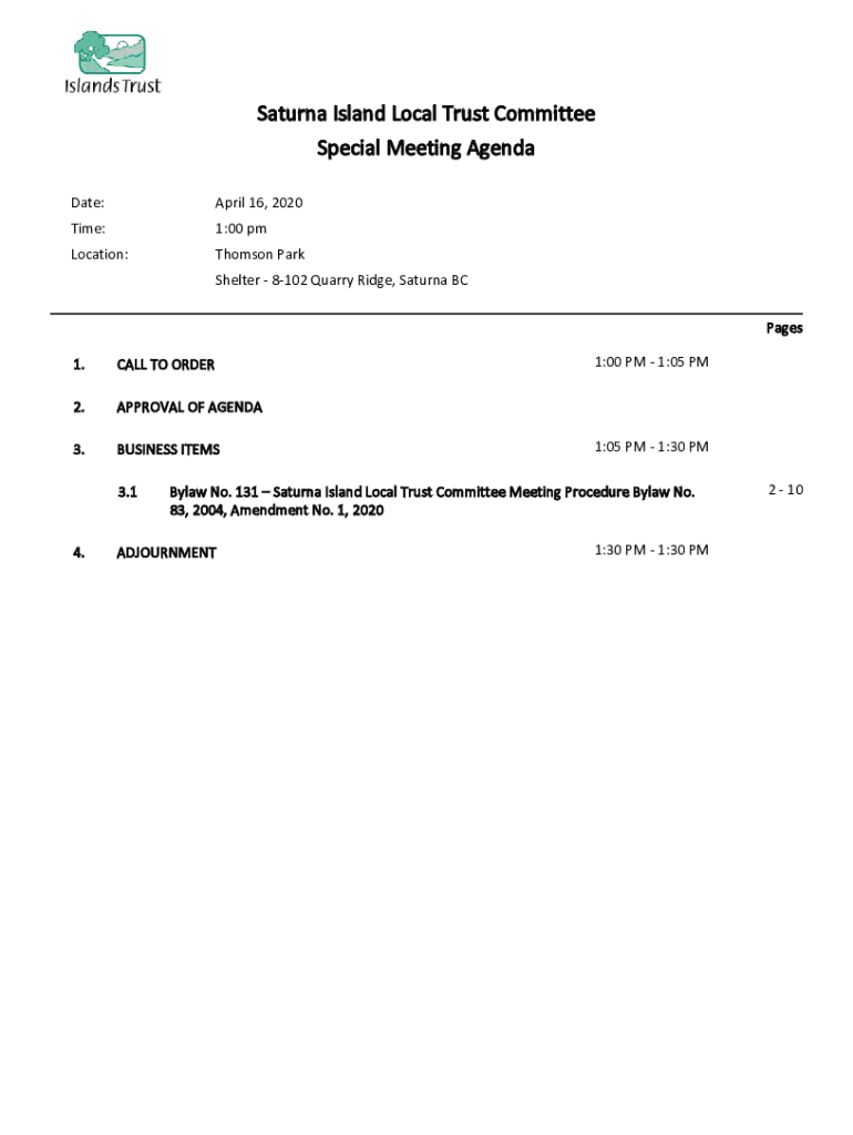Saturn Island Local Trust Committee Special Meeting Agenda Date:April 16, 2020Time:1:00 location:Thomson Park Shelter 8102 Quarry Ridge, Saturn BC Pages1.CALL TO ORDER2.APPROVAL OF AGENDA3.BUSINESS