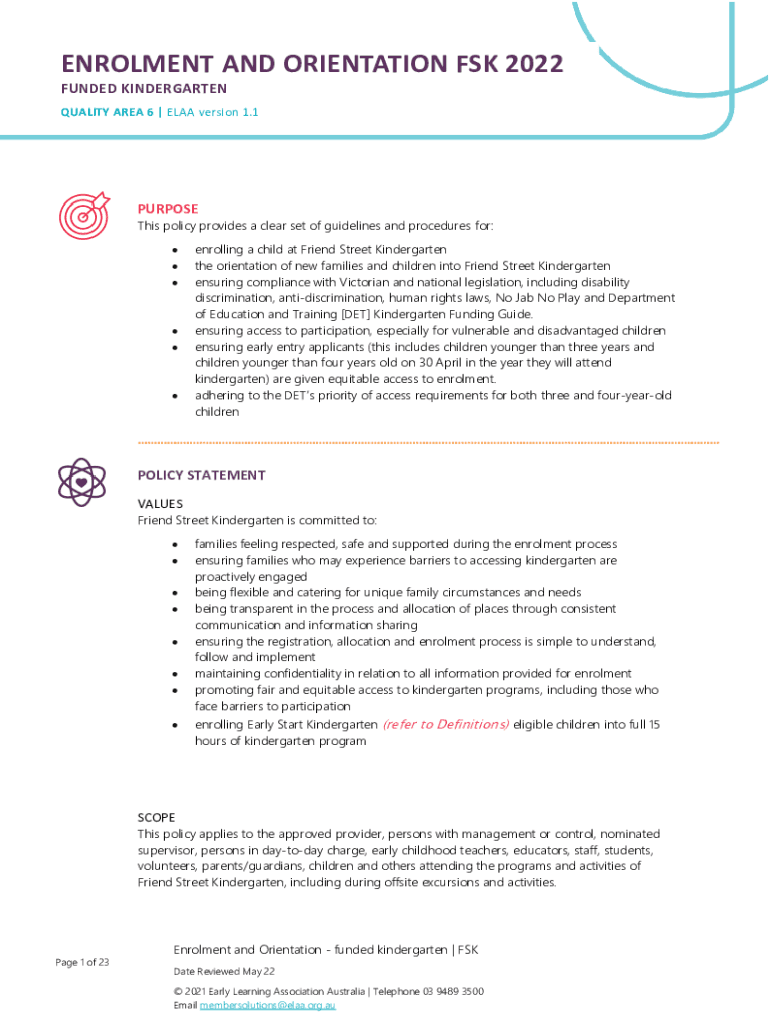 Enrollment AND ORIENTATION FSK 2022 FUNDED KINDERGARTEN QUALITY AREA 6 | ELLA version 1.1PURPOSE This policy provides a clear set of guidelines and procedures for: enrolling a child at Friend Street