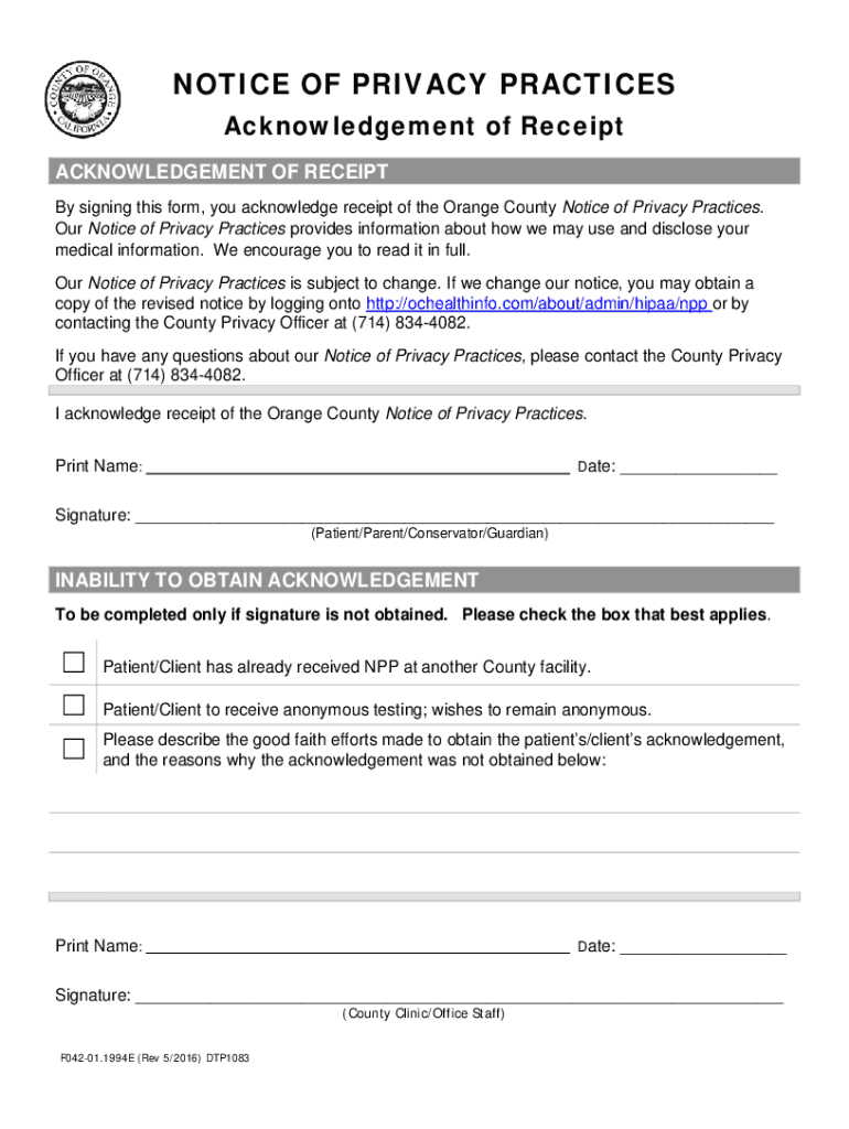 NOTICE OF PRIVACY PRACTICES Acknowledgement of Receipt ACKNOWLEDGEMENT OF RECEIPT By signing this form, you acknowledge receipt of the Orange County Notice of Privacy Practices. Our Notice of Privacy