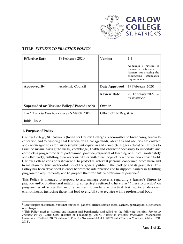 TITLE: FITNESS TO PRACTICE POLICY Effective Date19 February 2020Version1.1 Appendix 1 revised to include a reference to learners not meeting the program attendance requirements. Approved Academic