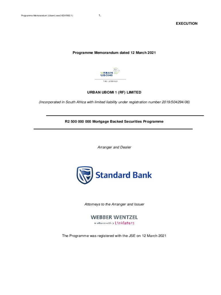 Program Memorandum (Bomb) EXE(16341963.1)1.EXECUTIONProgramme Memorandum dated 12 March 2021URBAN BOMB 1 (RF) LIMITED (Incorporated in South Africa with limited liability under registration number