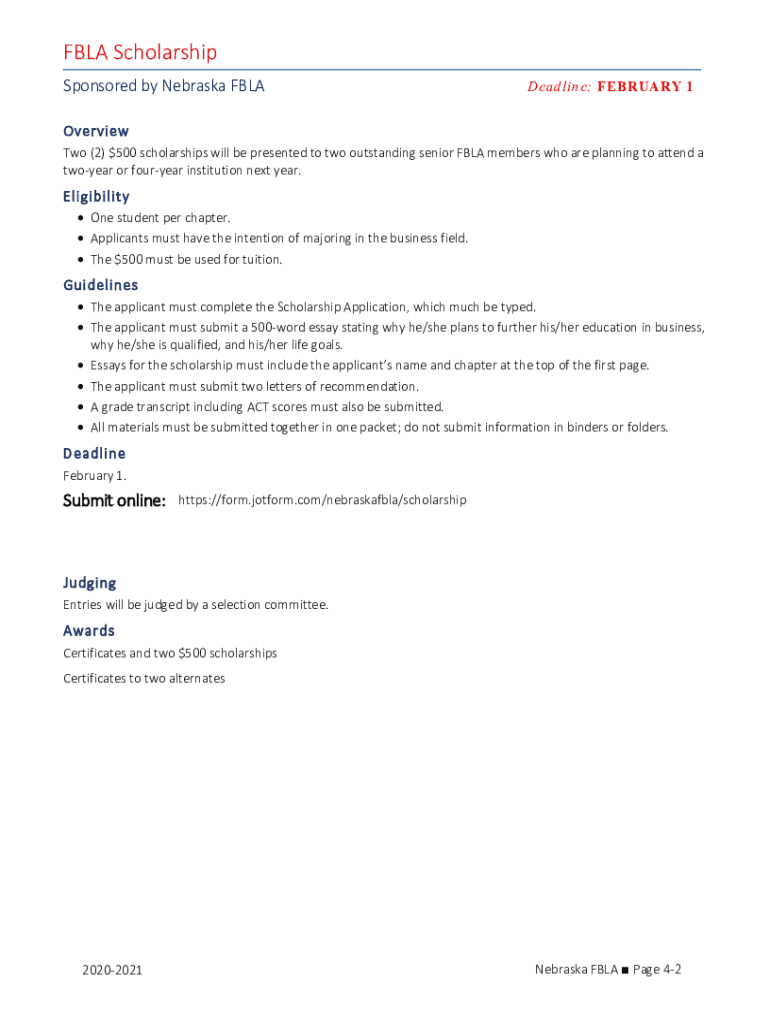 FBLA Scholarship Sponsored by Nebraska FBLADeadline: FEBRUARY 1Overview Two (2) $500 scholarships will be presented to two outstanding senior FBLA members who are planning to attend a two year or