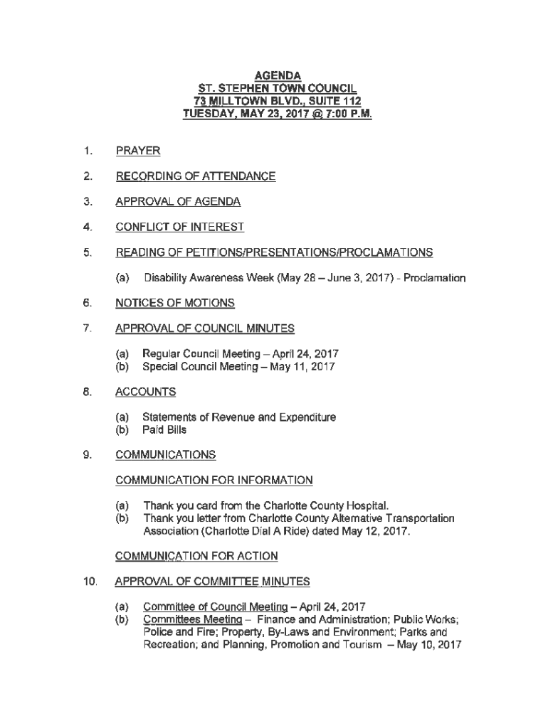 AGENDAS. STEPHEN TOWN COUNCIL 73 BLVD. SUITE 112 TUESDAY. MAY 23,2017@ 7:00P. M.1.PRAYER2.RECORDING OF ATTENDANCE3.APPROVAL OF AGENDA4.CONFLICT OF INTEREST5.READING OF PETITIONS/PRESENTATIONS/PROCLAMATIONS