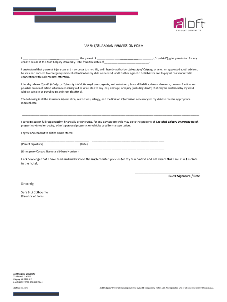 PARENT/GUARDIAN PERMISSION FORM I ___, the parent of ___ (my child), give permission for my child to reside at the Aloft Calgary University Hotel from the dates of ___. I understand that personal