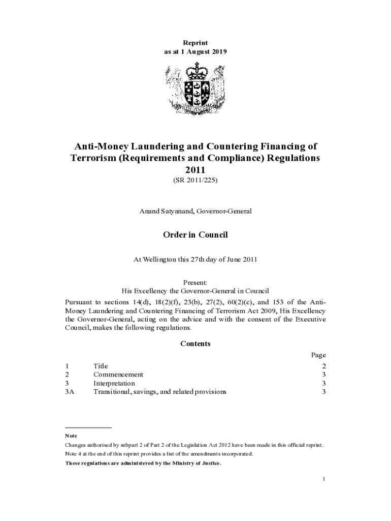 Reprint as at 1 August 2019AntiMoney Laundering and Countering Financing of Terrorism (Requirements and Compliance) Regulations 2011 (SR 2011/225)Anand Tatyana, GovernorGeneralOrder in Council At