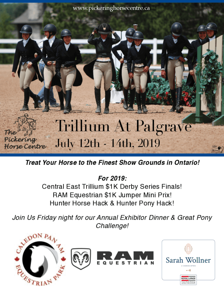 WWW.pickeringhorsecentre.trillium At Palgrave July 12th 14th, 2019 Treat Your Horse to the Finest Show Grounds in Ontario! For 2019:Central East Trillium $1K Derby Series Finals! RAM Equestrian $1K