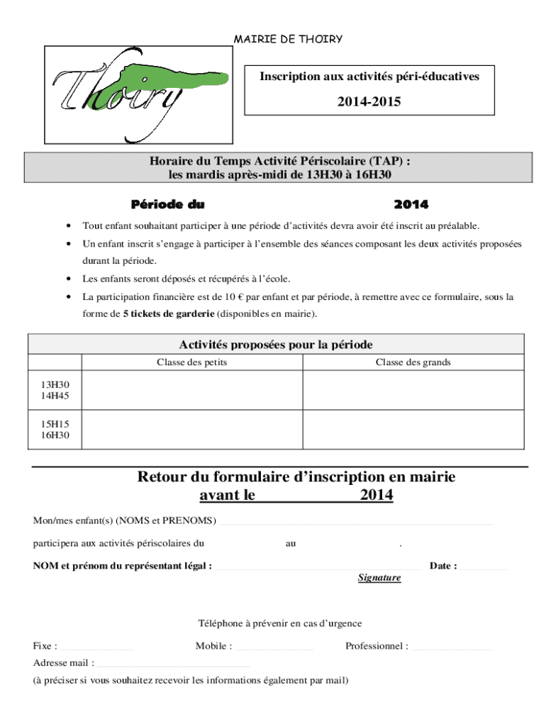 MARIE DE THOIRYInscription aux activity priducatives20142015Horaire Du Temps Activity Princelier (TAP) : LES Maris aprsmidi de 13H30 16H30 Pride du2014Tout Enfant cohabitant participle one pride activity