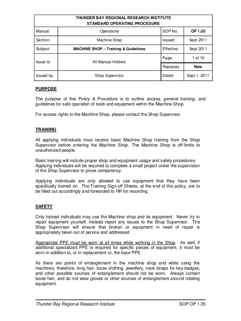 THUNDER BAY REGIONAL RESEARCH INSTITUTE STANDARD OPERATING PROCEDURE Manual:OperationsSection:Machine ShopSubject:MACHINE SHOP Training & GuidelinesIssue to:All Manual Holders 1.05SOP No. Issued:Sept