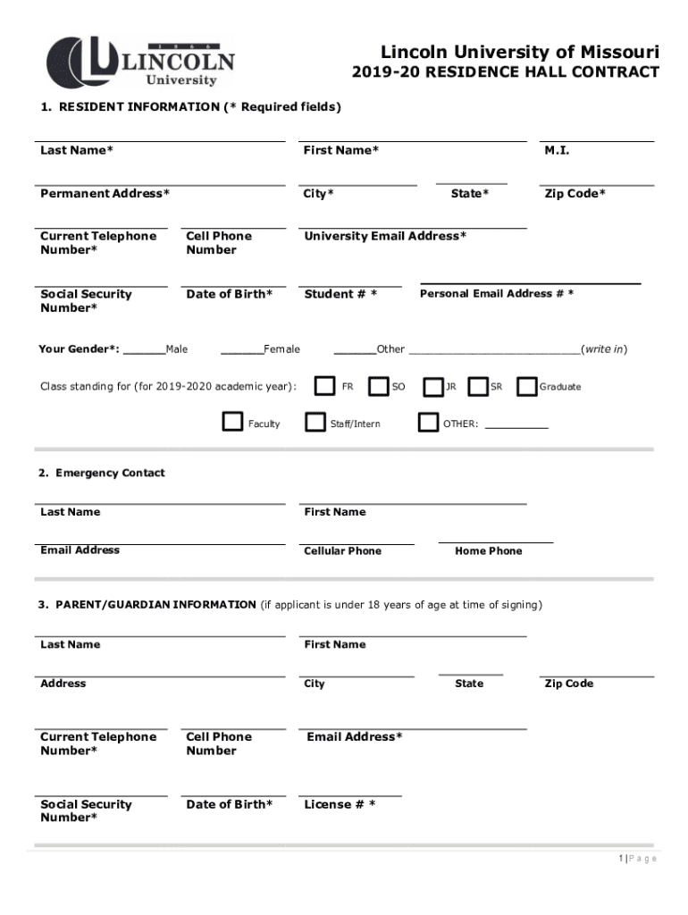 Lincoln University of Missouri 201920 RESIDENCE HALL CONTRACT 1. RESIDENT INFORMATION (* Required fields)Last Name×First Name×Permanent Address×City×M.I. State×Current Telephone Number×Cell