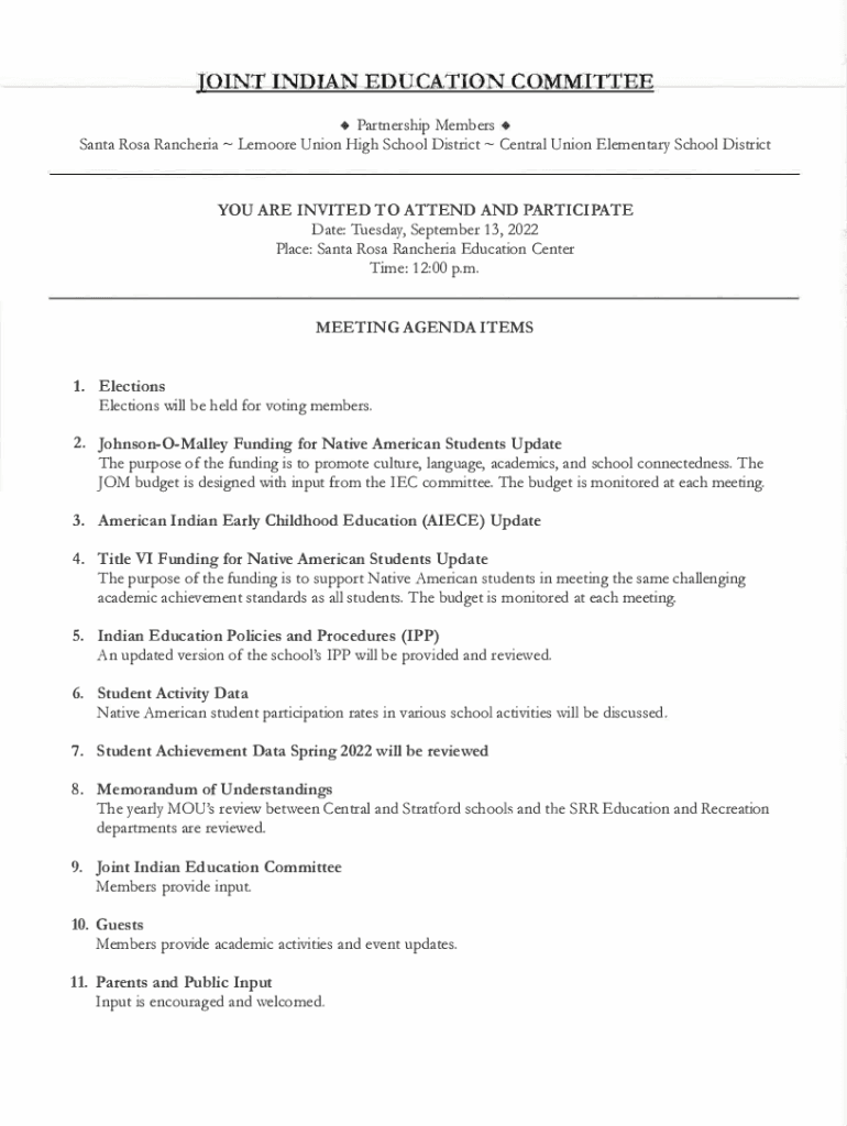 JOINT INDIAN EDUCATION.COMMITTEE Partnership Members Santa Rosa Ranchers Lemaitre Union High School District Central Union Elementary School District ARE INVITED TO ATTEND AND PARTICIPATE Date: Tuesday,
