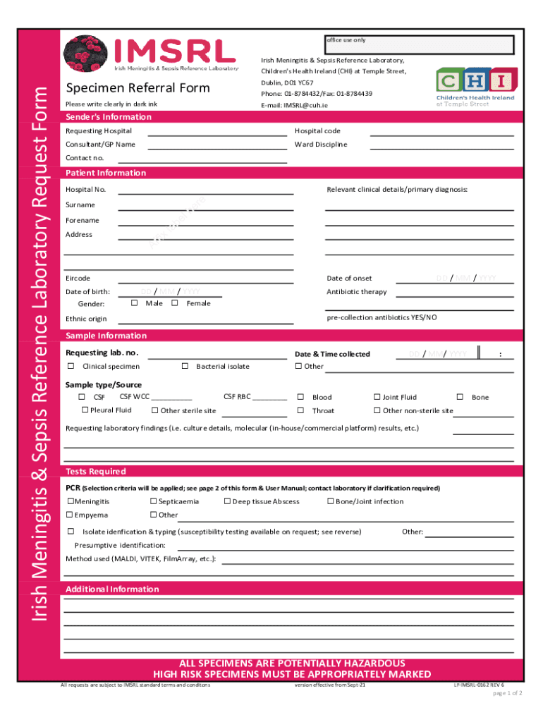 Office uses only Irish Meningitis & Sepsis Reference Laboratory, Irish Meningitis & Sepsis Reference Laboratory Request Godchildren\'s Health Ireland (CHI) at Temple Street, Specimen Referral Form