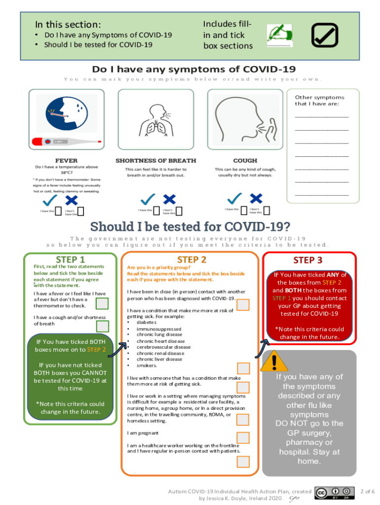 Autism COVID-19 Individual Health Action Plan Ireland Testing Format 2.0CONTENTS: SECTION ONE: Do I have any Symptoms of COVID-19 Should I be tested for COVID19SECTION TWO: How I can contact my GP