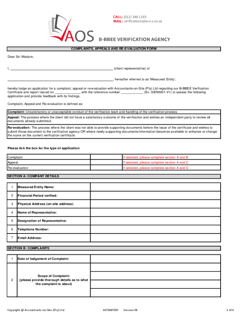 COMPLAINTS, APPEALS AND REEVALUATION FORM Dear Sir/ Madam, I, (client representative) of, hereafter referred to as \'Measured Entity\', hereby lodge an application for a complaint, appeal or reevaluation