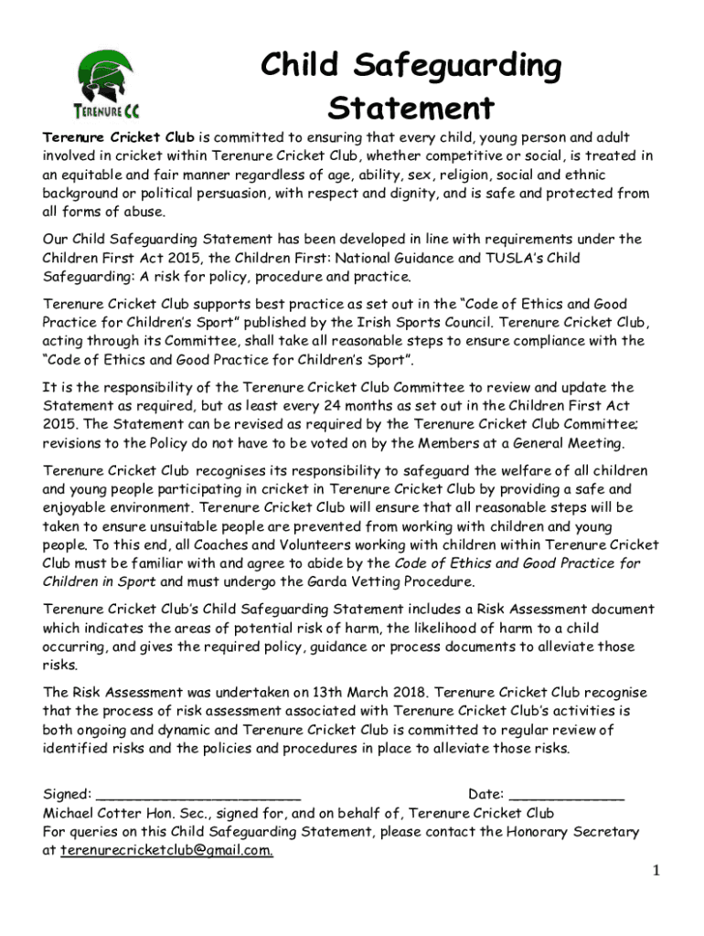 Child Safeguarding Statement Tenure Cricket Club is committed to ensuring that every child, young person and adult involved in cricket within Tenure Cricket Club, whether competitive or social, is
