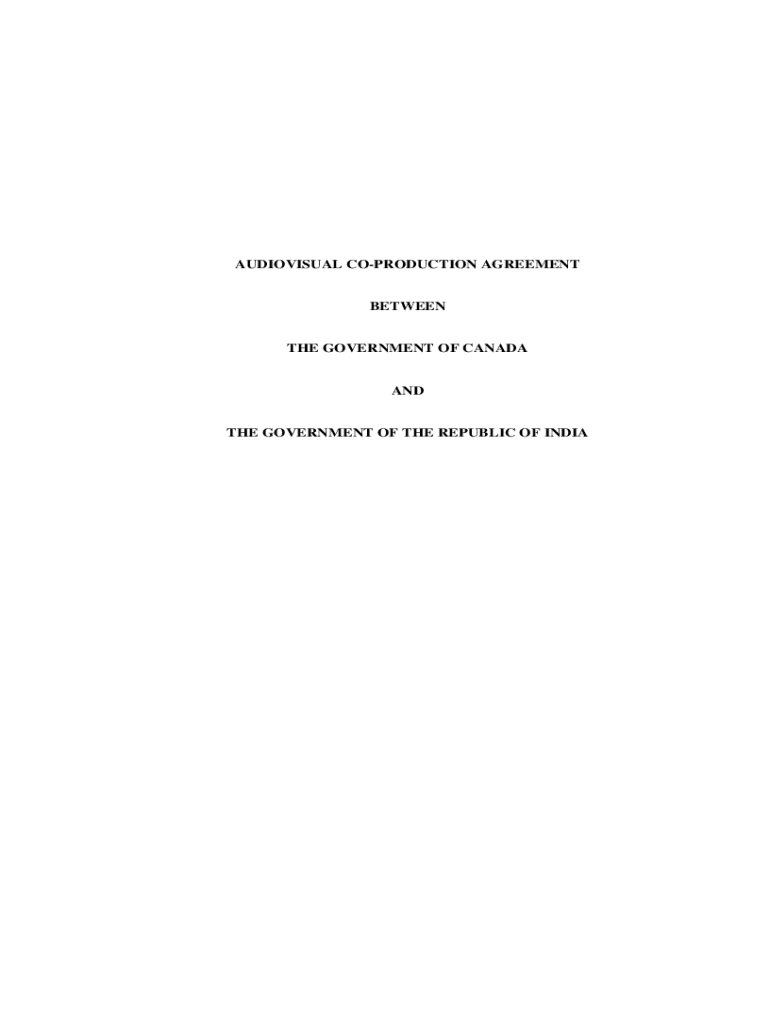 AUDIOVISUAL PRODUCTION AGREEMENTBETWEENTHE GOVERNMENT OF CANADAANDTHE GOVERNMENT OF THE REPUBLIC OF INDICATE GOVERNMENT OF CANADA AND THE GOVERNMENT OF THE REPUBLIC OF INDIA (the Parties), RECOGNIZING