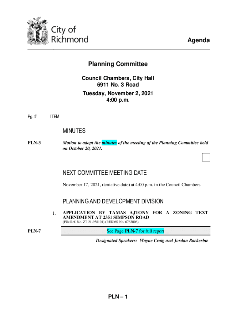 AgendaPlanning Committee Council Chambers, City Hall 6911 No. 3 Road Tuesday, November 2, 2021 4:00 p.m. Pg. #TERMINATES PLN3Motion to adopt the minutes of the meeting of the Planning Committee held