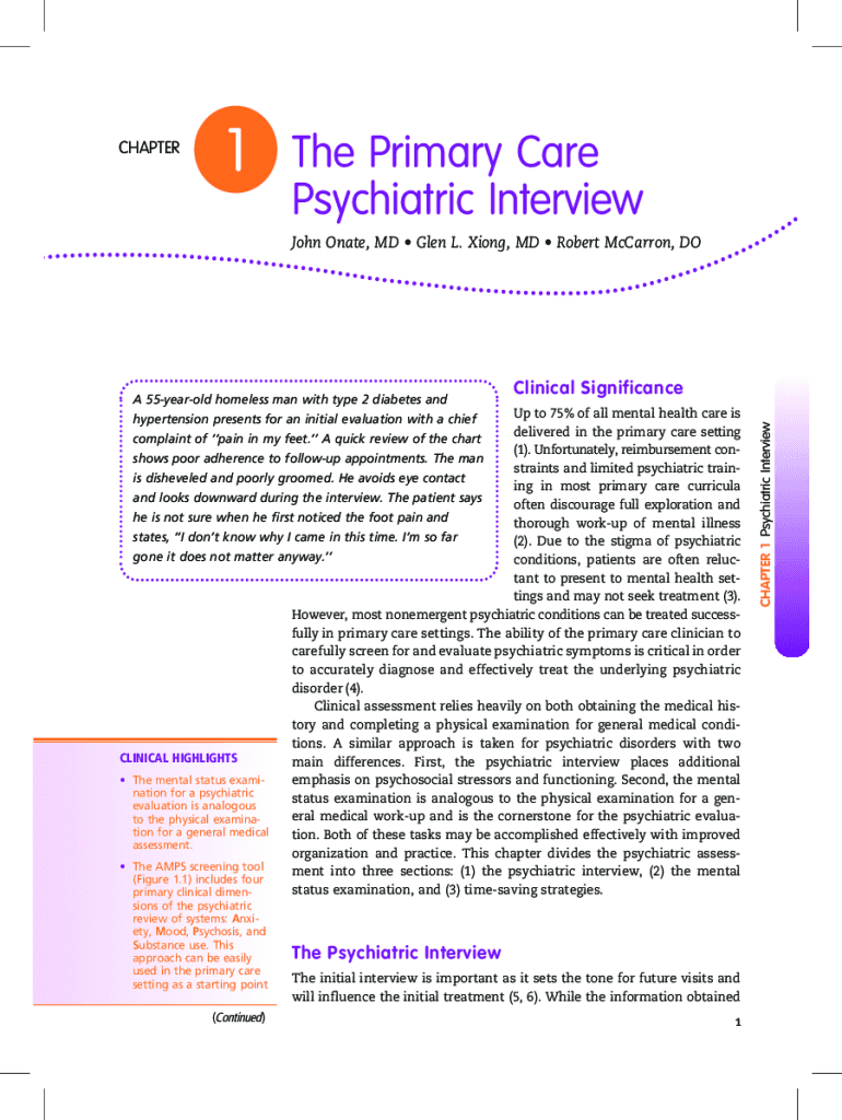 CHAPTER1The Primary Care Psychiatric Interview John Donate, MD Glen L. XING, MD Robert Macaroon, DOA 55yearold homeless man with type 2 diabetes and... ... ... ... ... ... ... ... ... .... Clinical