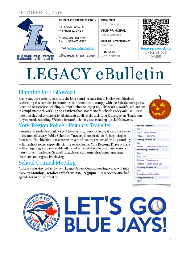 OCTOBER 14, 2016, CONTACT INFORMATION 61 Russell Jarvis Dr. Markham L3S 4B1Phone: 9054724764Fax: 9054722322Email: legacy.ps@yrdsb.caPRINCIPAL Laura RyckmanVICEPRINCIPAL Mary DemacioSUPERINTENDENT