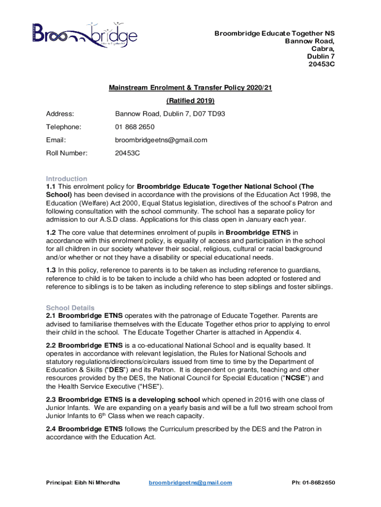 Broom bridge Educate Together NS Ban now Road, Cobra, Dublin 7 20453CMainstream Enrollment & Transfer Policy 2020/21 (Ratified 2019) Address:Ban now Road, Dublin 7, D07 TD93Telephone:01 868 2650Email:broombridgeetns@gmail.