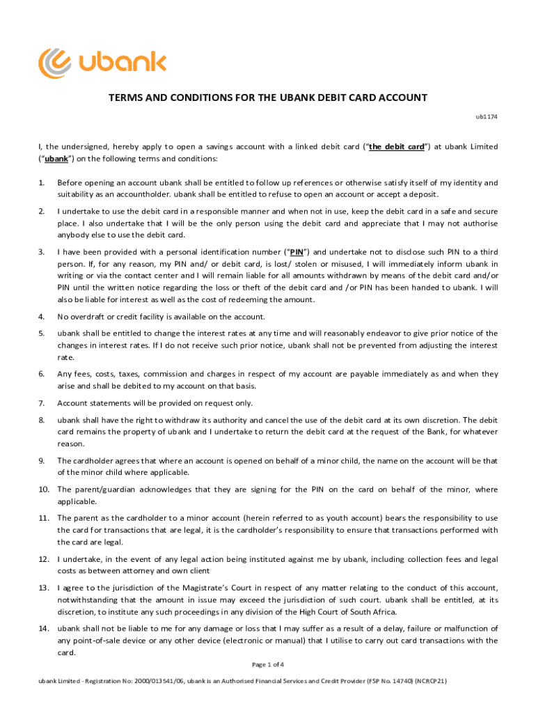 TERMS AND CONDITIONS FOR THE BANK DEBIT CARD ACCOUNT ub1174I, the undersigned, hereby apply to open a savings account with a linked debit card (the debit card) at bank Limited (bank) on the following