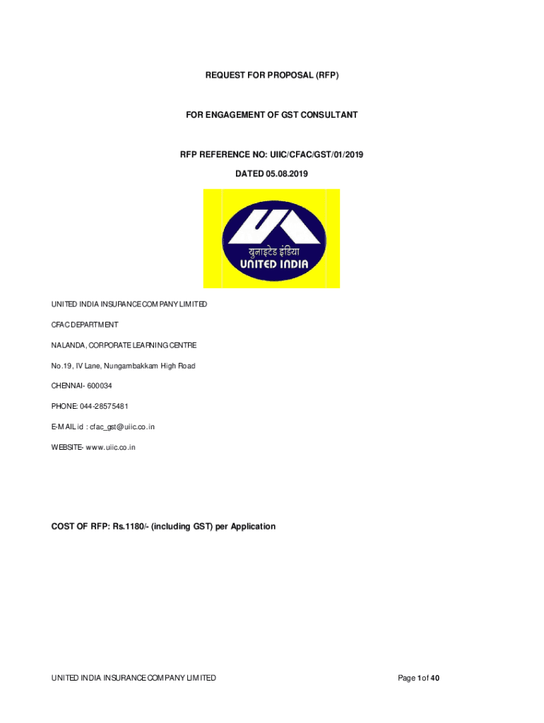 REQUEST FOR PROPOSAL (RFP)FOR ENGAGEMENT OF GST CONSULTANT RFP REFERENCE NO: AIIC/CAC/GST/01/2019 DATED 05.08.2019UNITED INDIA INSURANCE COMPANY LIMITED CAC DEPARTMENT AMANDA, CORPORATE LEARNING Center