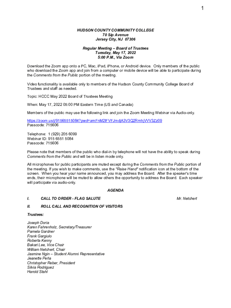 1HUDSON COUNTY COMMUNITY COLLEGE 70 Sip Avenue Jersey City, NJ 07306 Regular Meeting Board of Trustees Tuesday, May 17, 2023 5:00 P.M., Via Zoom Download the Zoom app onto a PC, Mac, iPad, iPhone,