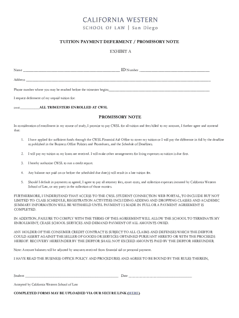 TUITION PAYMENT DEFERMENT / PROMISSORY NOTE EXHIBIT Name___ ID Number ___Address___Phone number where you may be reached before the trimester begins___ I request deferment of my unpaid tuition for:
