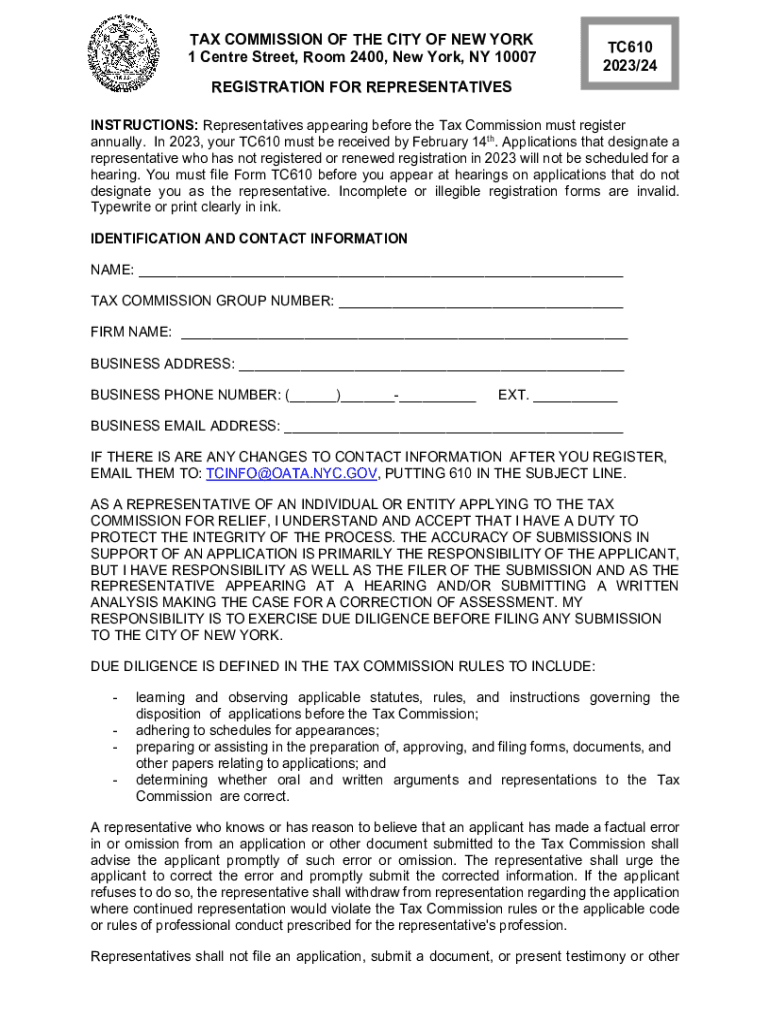 TAX COMMISSION OF THE CITY OF NEW YORK 1 Center Street, Room 2400, New York, NY 10007 REGISTRATION FOR REPRESENTATIVESTC610 2023/24INSTRUCTIONS: Representatives appearing before the Tax Commission