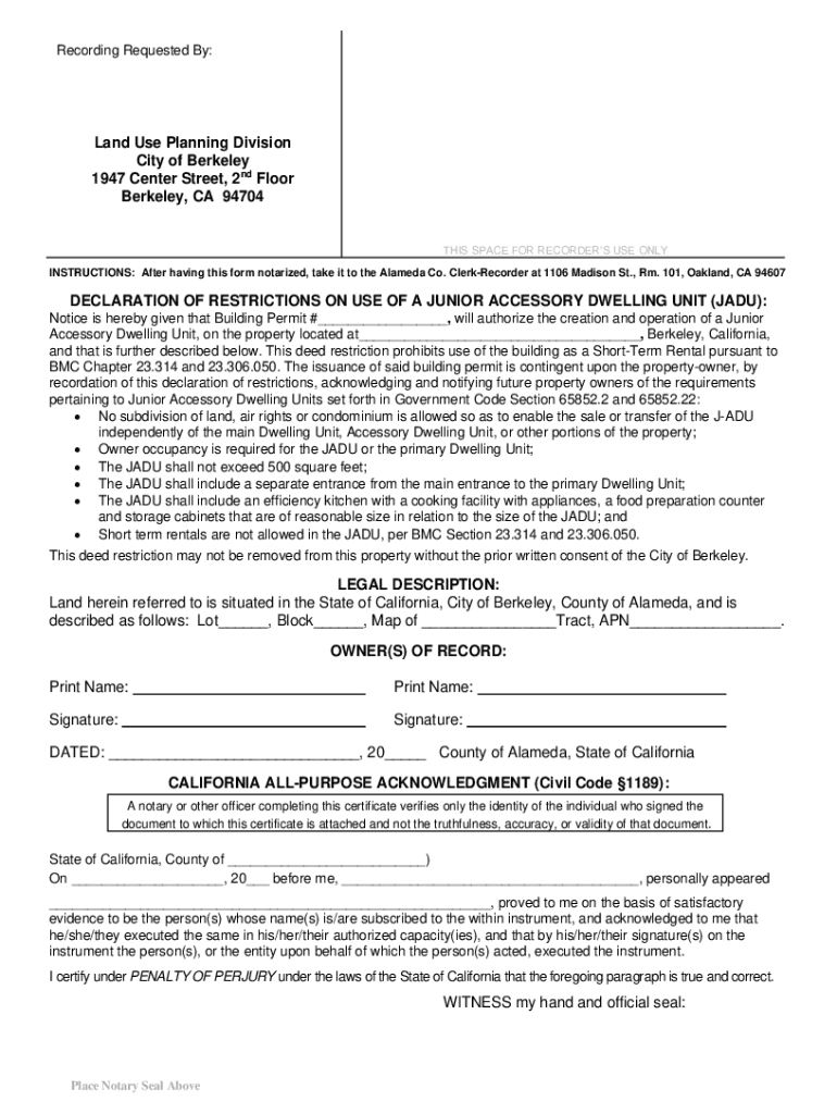 Recording Requested By:Land Use Planning Division City of Berkeley 1947 Center Street, 2nd Floor Berkeley, CA 94704THIS SPACE FOR RECORDERS USE ONLY INSTRUCTIONS: After having this form notarized,