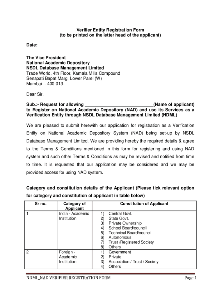 Verifier Entity Registration Form (to be printed on the letter head of the applicant) Date: The Vice President National Academic Depository NDDL Database Management Limited Trade World, 4th Floor,