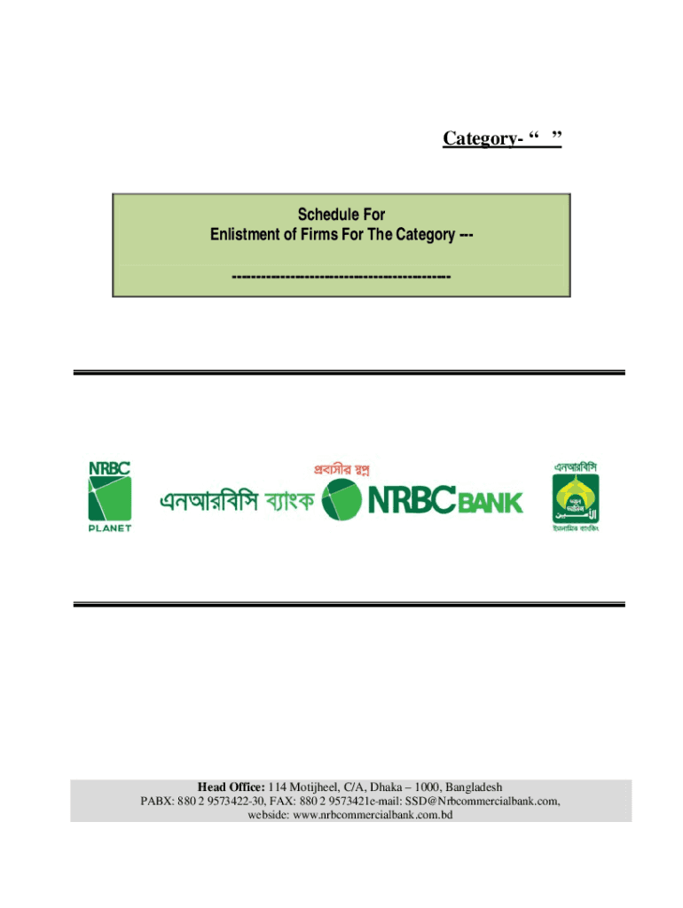 Category Schedule For Enlistment of Firms For The Category Head Office: 114 Motijheel, C/A, Dhaka 1000, Bangladesh PBX: 880 2 957342230, FAX: 880 2 9573421email: SSD@Nrbcommercialbank.com, website: