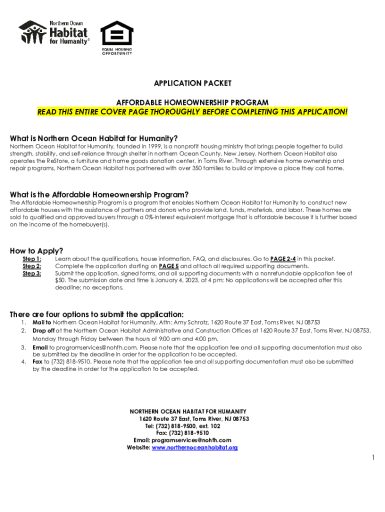 APPLICATION PACKET AFFORDABLE HOMEOWNERSHIP PROGRAM READ THIS ENTIRE COVER PAGE THOROUGHLY BEFORE COMPLETING THIS APPLICATION! What is Northern Ocean Habitat for Humanity? Northern Ocean Habitat for