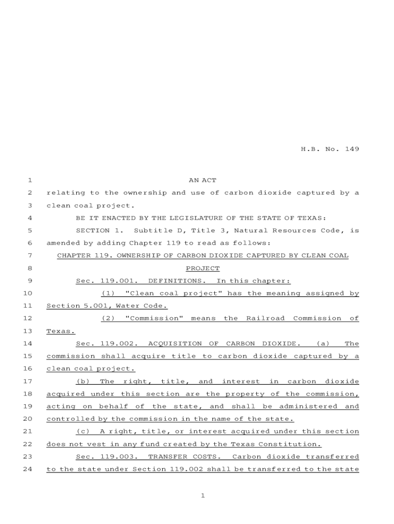 H.B.ANO. A1491AN ACT2relating to the ownership and use of carbon dioxide captured by a3clean coal project.4BE IT ENACTED BY THE LEGISLATURE OF THE STATE OF TEXAS:5SECTIONA1. Subtitle D, Title 3, Natural