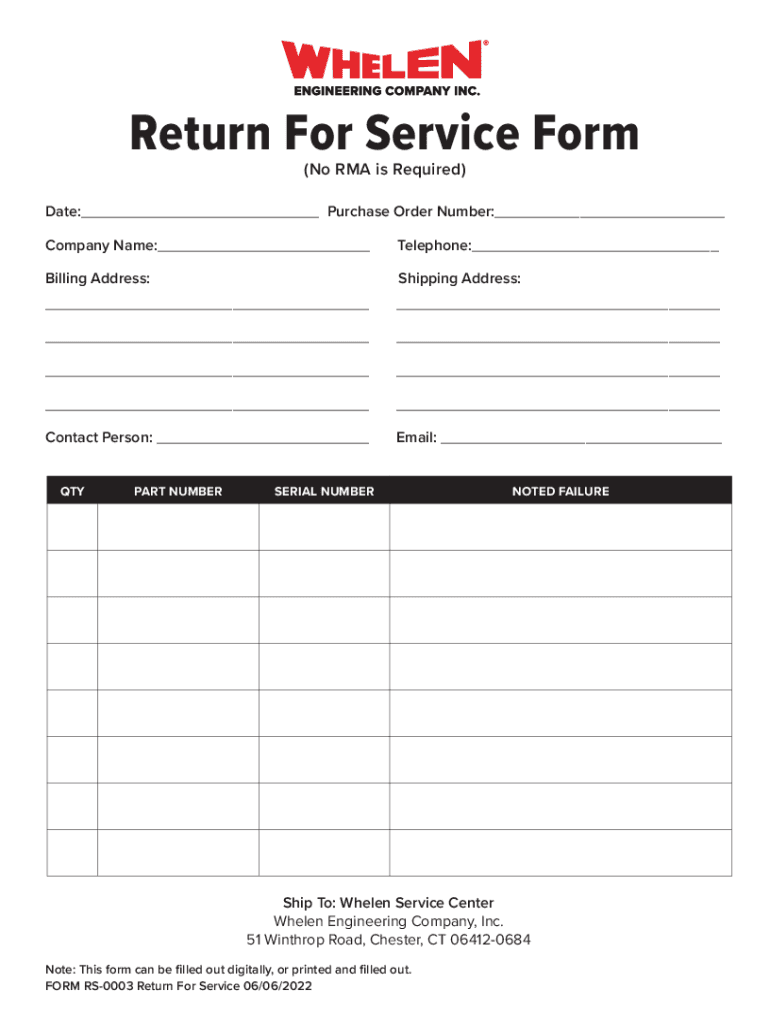 Return For Service Form (No RMA is Required)Date:___ Purchase Order Number:___ Company Name:___Telephone:___Billing Address:Shipping Address:________________________Contact Person: ___Email: ___PART