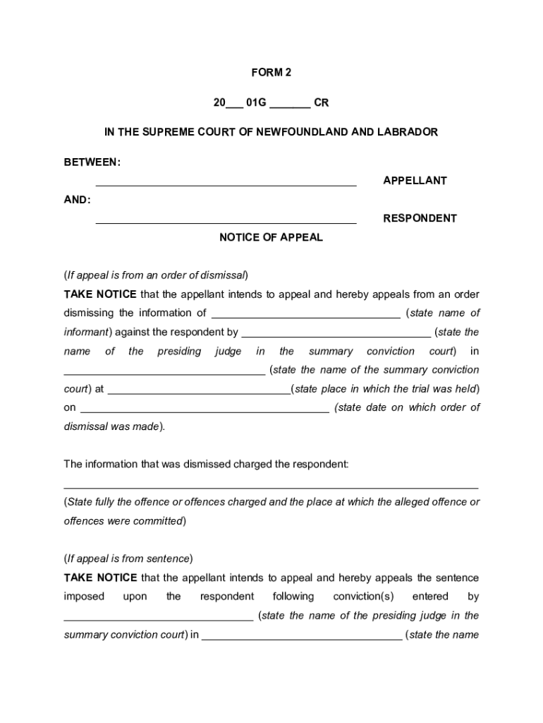 FORM 2 20___ 01G ___ CR IN THE SUPREME COURT OF NEWFOUNDLAND AND LABRADOR BETWEEN: ___APPELLANT___RESPONDENTAND: NOTICE OF APPEAL (If appeal is from an order of dismissal) TAKE NOTICE that the appellant