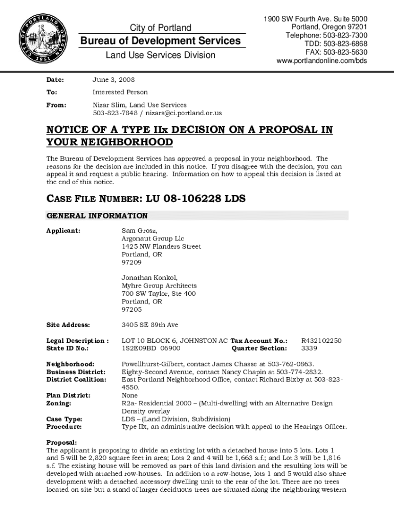City of PortlandBureau of Development Services Land Use Services Division Date:June 3, 2008To:Interested Personhood:Mizar Slim, Land Use Services 5038237848 / nizars@ci.portland.or.us1900 SW Fourth