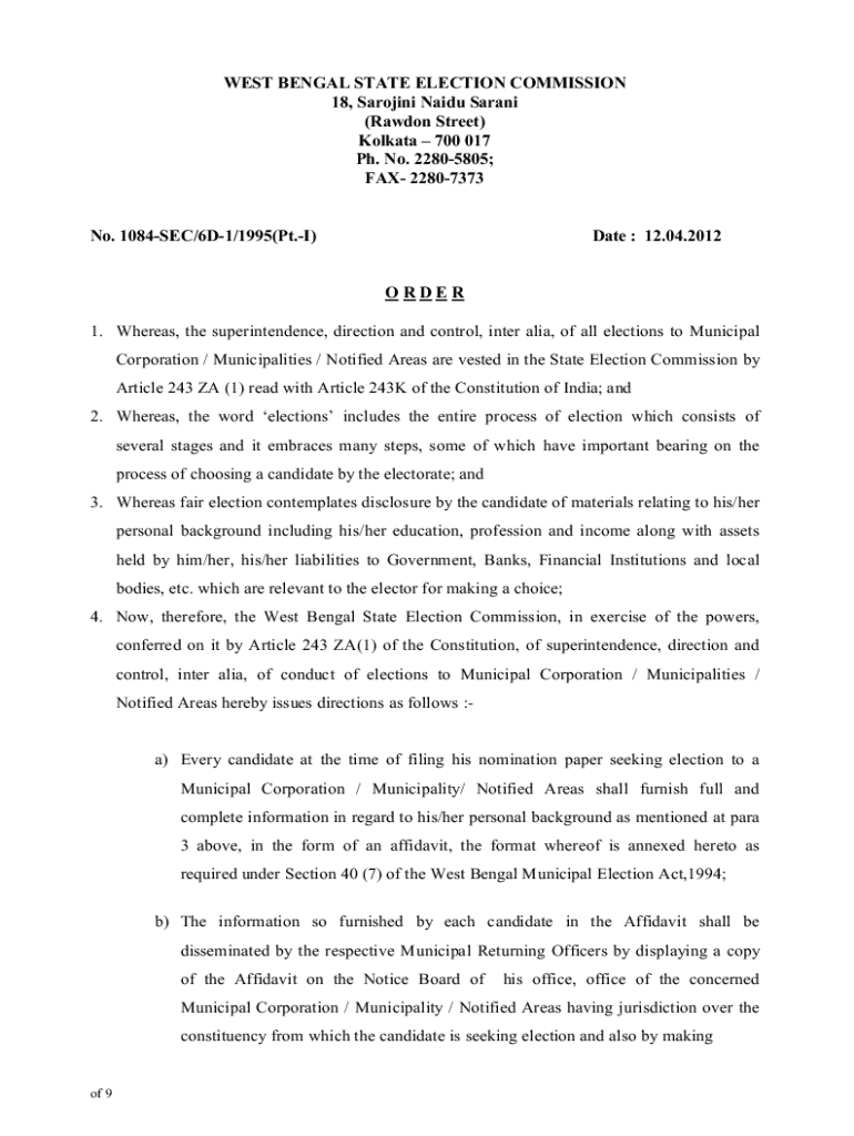 WEST BENGAL STATE ELECTION COMMISSION18, Carolina Baidu Saran(Radon Street)Kolkata 700 017Ph. No. 22805805;FAX 22807373No. 1084SEC/6D1/1995(Pt. I)Date : 12.04.2012O R D E R1. Whereas, the superintendence,