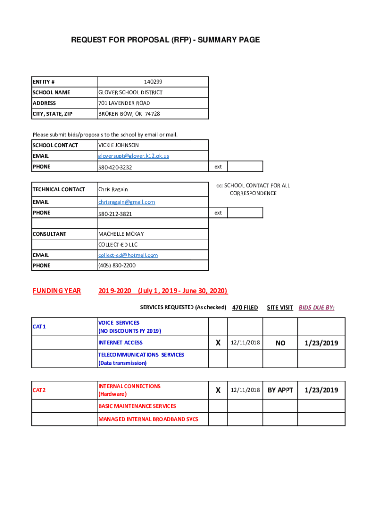 REQUEST FOR PROPOSAL (RFP) SUMMARY PATERNITY#140299SCHOOLNAMEGLOVERSCHOOLDISTRICTADDRESS701LAVENDERROADCITY,STATE, ZIPBROKENBOW,OK74728Pleasesubmitbids/proposalstotheschoolbyemailormail.