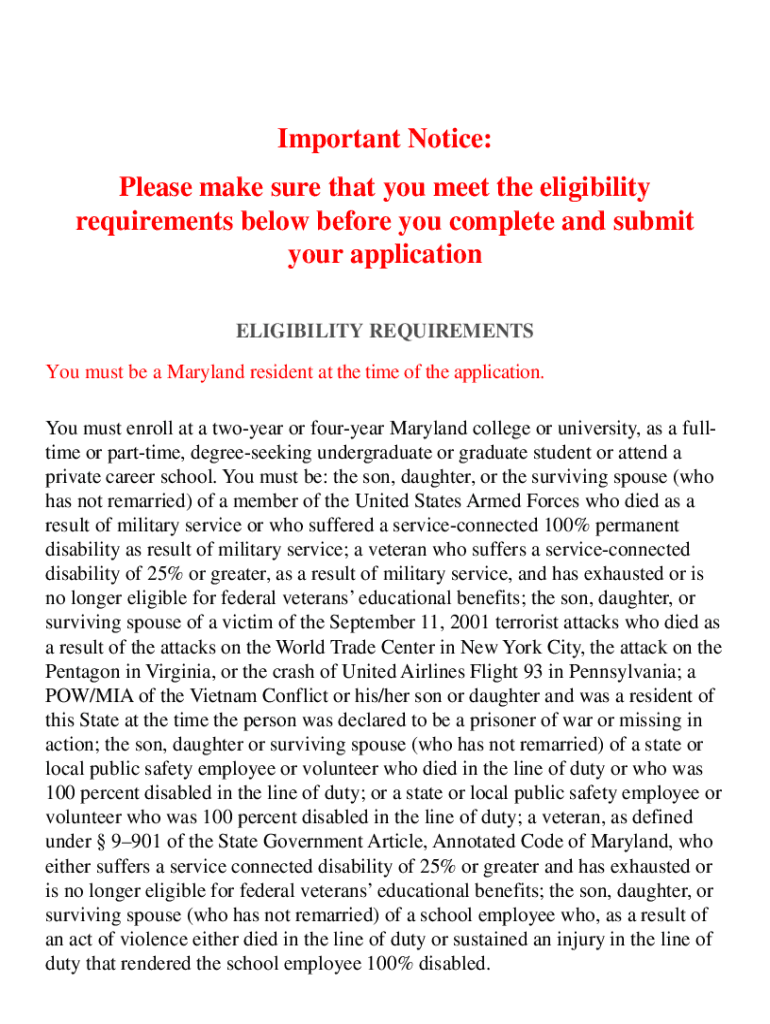 Important Notice: Please make sure that you meet the eligibility requirements below before you complete and submit your application ELIGIBILITY REQUIREMENTS You must be a Maryland resident at the