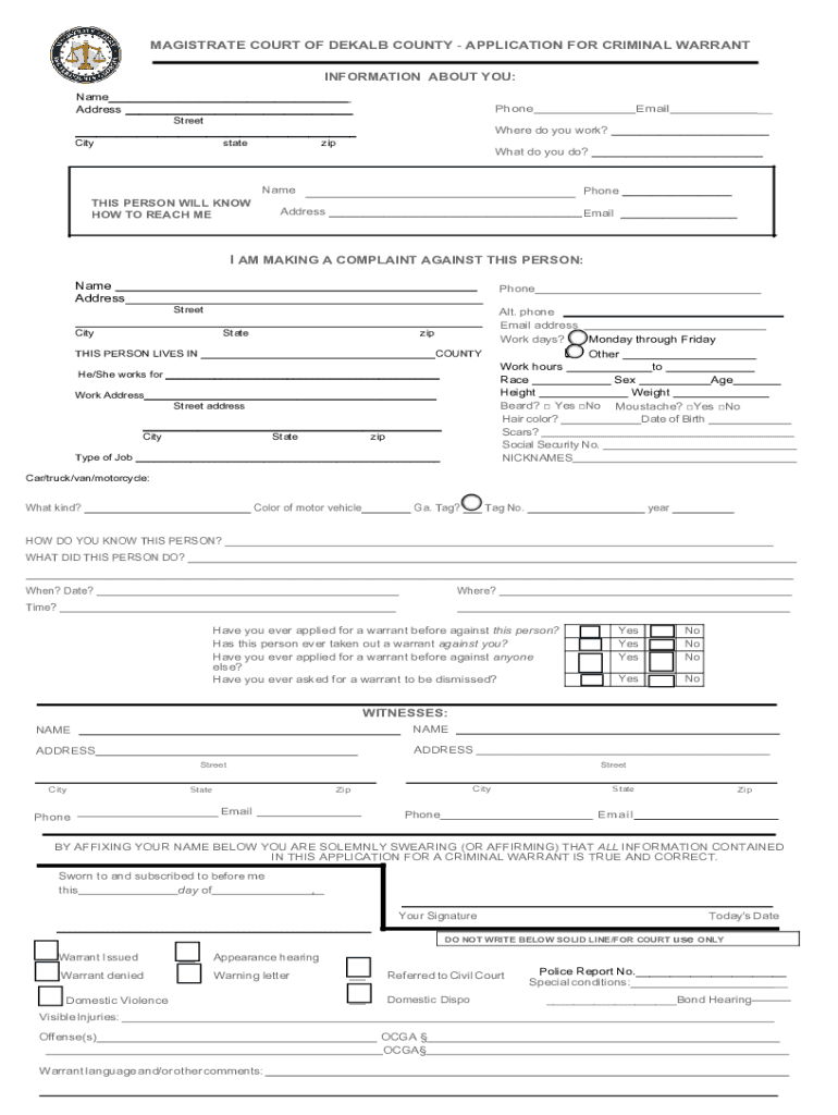 MAGISTRATE COURT OF DEKALB COUNTY APPLICATION FOR CRIMINAL WARRANT INFORMATION ABOUT YOU: Name___ Address ___Phone___Where do you work? ___StreetCitystateTHIS PERSON WILL KNOW HOW TO REACH MEzipEmail_What