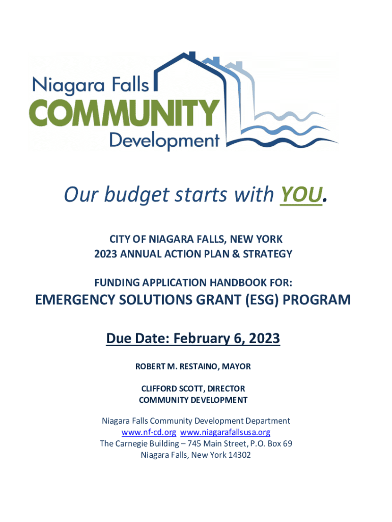 Our budget starts with YOU. CITY OF NIAGARA FALLS, NEW YORK 2023 ANNUAL ACTION PLAN & STRATEGY FUNDING APPLICATION HANDBOOK FOR:EMERGENCY SOLUTIONS GRANT (ESG) PROGRAM Due Date: February 6, 2023,
